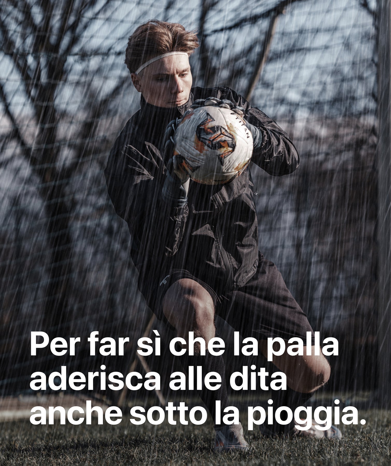 Anche quando piove a dirotto o il tempo è umido, il grip sul pallone rimane impareggiabile. AQUAGLU è stato appositamente sviluppato per massimizzare la presa dei guanti da portiere anche nelle condizioni più avverse. Per un controllo assoluto quando serve. -