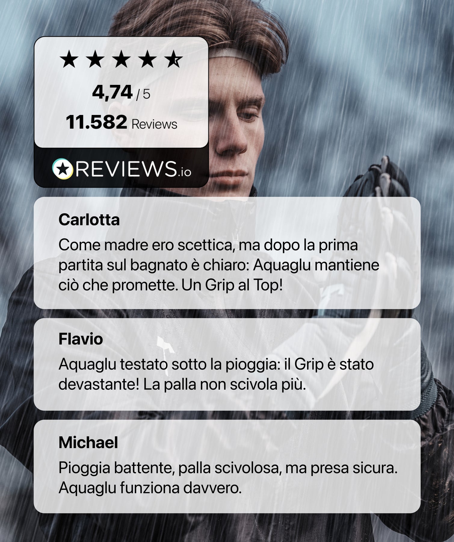 AQUAGLU è efficace in condizioni di pioggia e umidità. Quando piove si consiglia di scuotere regolarmente il pugno e strizzare i guanti. In questo modo, si spreme l'acqua dal lattice già prima che la palla lo colpisca. In caso di tempo asciutto, consigliamo TURBOGLU.